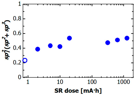 The C atoms in the DLC films consist of sp2 hybridization carbon and sp3 hybridization carbon. The sp2/sp3 ratio is considered to be a structural parameter that characterizes DLC film properties [3,40]. The absolute sp2/(sp2 + sp3) ratio of carbon atoms in the DLC film can be accurately determined from the C K edge NEXAFS spectra, as described in Refs. [41,42,43]. The SR dose dependence of the sp2/(sp2 + sp3) ratio in the hydrogenated Si-DLC film is plotted in Figure 10. The amount of sp2 bonded carbon atoms can be determined by normalizing the area of the resonance corresponding to the 1s → π* transitions at 285.4 eV with a large section of the spectrum. The absolute sp2/(sp2 + sp3) ratio was determined by comparing the normalized 1s → π* area from the sample with that from the NEXAFS spectrum of highly ordered pyrolytic graphite (HOPG) as a standard sample. The sp2/(sp2 + sp3) ratio of the hydrogenated Si-DLC film before irradiation (open circle) was ~0.23, which indicated that sp3 hybridized carbon was a major component of the hydrogenated Si-DLC film. The sp2/(sp2 + sp3) ratio increased rapidly to ~0.5 for SR doses less than 20 mA·h. At doses of more than 20 mA·h, the sp2/(sp2 + sp3) ratio remained approximately constant at ~0.5.