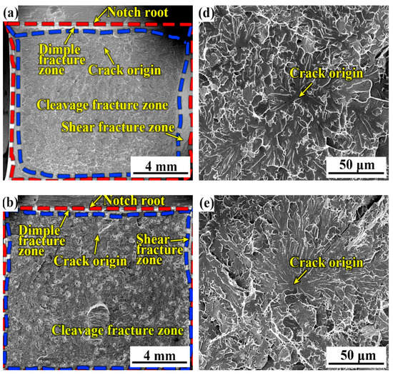 Typical fracture surfaces of three weld metals at −40 °C. (a,d) B1; (b,e) B2; (c,f) B3.