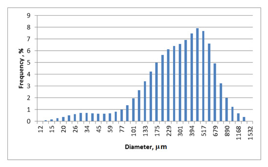The particle size distributions were measured using a HORIBA Laser Scattering Particle Size Distribution Analyzer LA-950. BCP particles were dispersed in isopropanol and used in the funnel of the Analyzer LA-950. Sonication was performed to disperse the particles thoroughly. Particle size distribution calculations were made on the volume basis. Particle size measurements showed that the sizes of the BCP particles ranged from about 13 to 1400 μm (Figure 2). The mean size and standard deviation of the particle distributions are 337 and 221 μm, respectively. Characteristic values of particle size were accordingly about 93 μm (d10 particles of this and smaller diameter constituting 10% of the total volume of all particles in the sample), and about 663 μm (d90 particles of this and smaller diameters constituting 90% of the total volume (mass) of all particles in the sample). Probably large particles in the mass of waste are ground blackcurrant seeds.