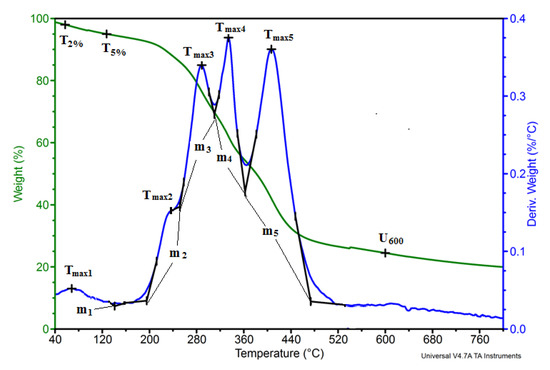 On the basis of the DTG curves, the temperature of the beginning and end of individual degradation stages Ti and Ti + 1, as well as the weight loss at the beginning and end of each stage (mi and mi + 1), were determined, which allowed the determination of the change in mass during—Δm = (mi + 1−mi). The maximum degradation rate (Vmax) and the temperature at which the maximum degradation rate (Tmax) of each stage was reached were also determined.