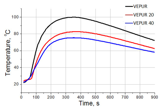 Core temperature profiles of viscoelastic polyurethane foam (VEPUR) foams and composites with 20% and 40 php BCP.