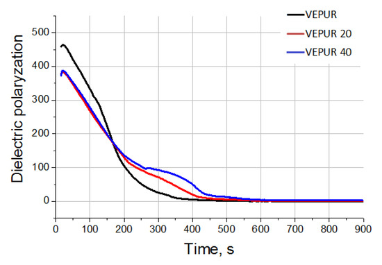After about 180 s, until the end of the synthesis process, the speed of the dielectric polarization changes for composites is higher than that for VEPUR. In foams with more filler, the reaction rate is faster than in foams with less BCP. This is probably due to the release of water bounded by the filler (added as part of the filler) and the isocyanate–water reaction, which is highly exothermic. After approximately 600 s, the dielectric polarization for all materials clearly decreases, which indicates the end of the reaction.