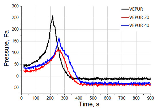 The introduction of BCP had an impact on the internal pressure during the foaming process (Figure 6). As observed, the addition of BCP caused a decrease in the maximum pressure during the foaming process. The filler particles may promote the release of CO2 formed on their surfaces during the reaction. The introduction of a 20 php filler caused a significant reduction in pressure as the foams rise. This is probably also the result of the formation of more pore nuclei around the filler particles due to the formation of CO2 as a result of the reaction of NCO groups with H2O bound to the filler particles. A larger number of germ pores promotes their opening. However, with a larger amount of filler (40 php), the pressure in the foam core is insignificantly higher than after adding 20 php. The increase in pressure in this foam is due to the higher viscosity of the reaction mixture with higher filler content. A higher viscosity of the mix promotes the formation of larger pore walls, which limits the possibility of opening the pores despite the formation of more germs. This causes an increased pressure in the foam core of VEPUR 40 compared to the VEPUR 20 foam, but it is still lower than the reference foam. The summary of the results of the analysis of the synthesis of foam and its composites with BCP are presented in Table 4.