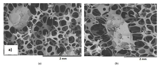 The fine cell structure with a developed pore surface promotes the viscoelastic properties of foams. The addition of a filler with 30 php reduces the pore size, which then promotes the viscoelastic properties of VEPUR foams. The introduction of the filler causes it to be built into the pores. This phenomenon was illustrated by SEM pictures of foams with large filler particles or aggregates (Figure 9).