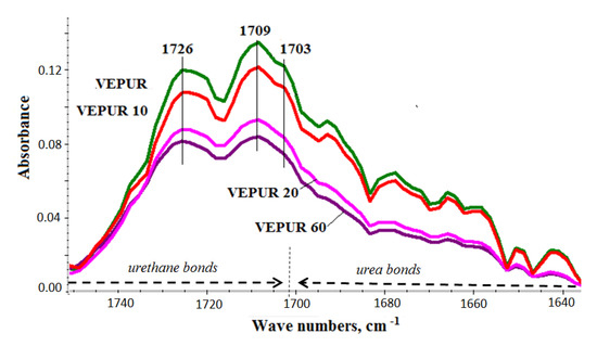Based on the presented spectra (Figure 10), it can be concluded that the appearance of new bands was not observed, and their positions were not shifted as a result of adding BCP. Only the intensity of the existing bands changed. The spectra of foams and their composites contain bands typical of polyurethanes (Table 6). The change in the multiplet band from the vibration of carbonyl groups in the range 1640–1750 cm−1 was assessed (Figure 11). Adding a different amount of filler changed the course of this band: therefore, this band was divided into component bands and the share of hydrogen bonds connecting the rigid segments, and the degree of phase separation, as well as the share of urea bonds, was calculated. The methodology for calculating these values is presented in the paper of M.M. Mazurek et al. [47]. The calculated results are presented in Table 6. It was found that the content of the hydrogen bond and the degree of phase separation decreased after adding the filler and were similar for all BCP foams despite the introduction of different amounts of filler. The introduction of the filler causes the distances between the rigid segments in composite macromolecules. Increasing the distance between the rigid segments reduces the possibility of the formation of hydrogen bonds between them. Only slight differences in the share of urethane and urea bonds were observed. With the filler, we introduce more water into the reaction medium. The greater the amount of filler, the greater the amount of water introduced to it. Water can react with isocyanate groups to produce symmetrically substituted urea and CO2. The rate of reaction of water with isocyanate groups is more than three times greater than that of secondary hydroxyl groups with these groups. However, the results of the FTIR analysis indicate that with the increase in the amount of filler in the tested VEPURFs, the share of urea bonds slightly decreased. The reason for the observed tendency to decrease the share of urea bonds in the tested VEPURFs may be the decreasing concentration of isocyanate groups after the first stage of the reaction (up to approximately 180 s). As can be seen from the dielectric polarization curves (Figure 5), in this stage, the VEPUR reaction is faster than for VEPUR 20 and VEPUR 40. If the reaction is faster in this stage, more NCO groups will react with the OH groups of the polyols during this time, forming urethane bonds. The differences in the level of urethane bonds formed in VEPUR 20 and VEPUR 40 in the first phase of the reaction may be influenced by the reaction temperature (Figure 4). The VEPUR 20 foam reaches a higher temperature than the VEPUR 40 foam, which increases the rate of reaction of the NCO and OH groups of polyols, favoring the formation of more urethane bonds in VEPUR 20 foam. If in the first phase of the reaction a greater number of NCO groups reacted with OH groups, there was less isocyanate left in the reaction medium, which could react with H2O introduced with filler I, and less urea bonds were formed in the foams (Table 7).
