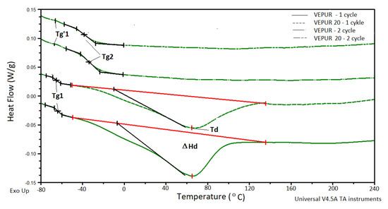 On the DSC thermograms of the tested materials, the occurrence of a soft phase glass transition temperature (Tg1), a large endothermic peak associated with the change in enthalpy (ΔHd) with a minimum at the temperature (Td), was observed. This peak is associated with a change in order in the soft phase containing scattered hard domains. In the second heating cycle, two transformations associated with a soft phase glass transition (Tg’1) and in the soft phase mixed with hard domain (Tg2) were detected. The specific heat change (Δ cp) was also determined.