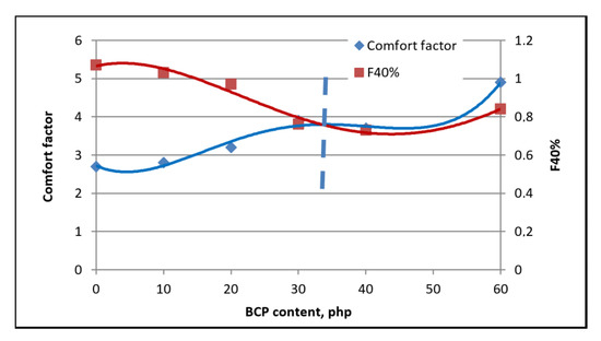 It was observed that the comfort factor increased as the filler content increased. This is probably the result of decreased foam elasticity due to the reduction of the mobility of macromolecules in the pore walls, which is due to the incorporation of filler particles. The F40% hardness decreased for foams containing up to 30% php, after which it increased with higher filler contents. The nature of changes in foam hardness with increased filler content is the same as the nature of changes in foam porosity.