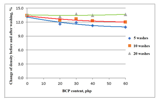 Viscoelastic foams can be used to make mattresses for nursing homes and people with disabilities or bed-ridden. It is preferred that these foams are amenable to repeated washing. Therefore, it was analyzed whether the tested materials could be washed. The results of the analysis of foam density changes are presented in Figure 16. After five and 10 washes, significant changes in foam density were observed, which indicates that foam particles and/or filler leached from the foams. The more the foam filler, the smaller the change in the observed material’s apparent density.