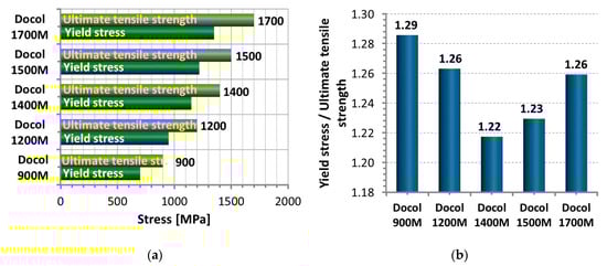 Selecting the steel type to the application is conducted based on a range of the material type from Docol 900 M up to Docol 1500 M at details of chemical composition [29] and mechanical properties (Figure 1). As can be noticed in Table 1, the relationship between the C and Mn elements follows the steel type, reaching the value of 0.03 at Docol 900 M and 0.19 at Docol 1500 M. From Figure 2a,b it is easy to note that the yield stress and ultimate tensile strength of Docol steels is represented by the wide range of values of 700 MPa to 1350 MPa and respectively 900 MPa to 1700 MPa at ductility min. 3%. The similar results were presented in [29]. With respect to an engineering point of view, a relationship between the mechanical parameters (Figure 2b) is important to assess the quality of the steel and its welding because the proportion enables to indicate a size of hardening region at the stress that reaches the yield point up to ultimate tensile strength. In this approach, an elongation plays a significant role because the parameter is directly related to ductility, enabling to avoid brittle cracking.