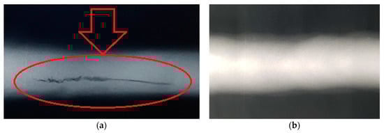 Weld after welding without (a) and with (b) micro-jet cooling in X-ray inspection.