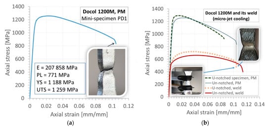 Tensile characteristics of the Docol 1200 M: (a) flat (un-notched) mini-specimen (b) applying U-notched and un-notched specimens to parent material (PM) and weld (micro-jet), E—Young’s modulus, PL—proportional limit, YS—yield stress, UTS—ultimate tensile strength.