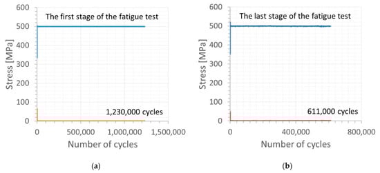 Maximum and minimum values of stress signal for the cycles: (a) and (b) up to 1,230,000, and 1,841,000 (sum before the material fracture = 1,841,757 cycles), respectively.