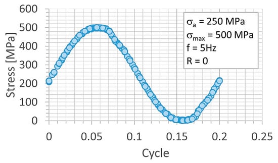 Fatigue tests were employed to follow the behavior of the micro-cooling weld joining of the Docol 1200 M under cyclic loading [41,42]. All tests were carried out at room temperature using the 8874 INSTRON servo-hydraulic testing machine (INSTRON, High Wycombe, England) and stress signal having the following parameters: stress ratio = 0, the range of the maximum values of stress from 500 MPa up to 700 MPa, frequency = 5 Hz (Figure 8). The stress signals were in the form of a cyclic function having a sinusoidal shape (Figure 9). The last 50 cycles of the fatigue tests were taken for capturing the weld behavior before fracture appearing. Practically, they were collected in the other files directly related to the analysis taken. The hourglass specimens having the weld in the middle section of the measuring region were used (Figure 7). The specimens were selected with the Docol 1200 M steel in a form of the sheet using a water cutting technology.