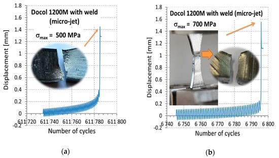 The last stage of fatigue tests before fracture of the Docol 1200 M steel’s micro-jet cooling weld for the following maximum values of stress: (a) 500 MPa and (b) 700 MPa.