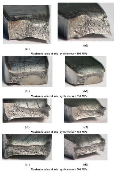 The fatigue tests have reflected the weld response on cyclic loading up to fracture (Figure 8 and Figure 11). As can be noticed on the fracture zone from the test at the maximum values of stress of 500 MPa (Figure 10) and 700 MPa (Figure 11), the fatigue damages occurred in the middle of the specimen, following directly the degradation of the micro-jet cooling weld under the cyclic loading. Differences in the weld behavior at various values of stress were expressed by changes in the orientation of the fracture regions, i.e., with an increase of the stress value, the axial stress was more dominant than the shear stress, showing a gradual vanishing of the second-mentioned stress component and it disappearing at the highest value of the stress applied (Figure 11). Moreover, variations in displacement versus a number of cycles, employed to follow the weld response on the cyclic loading, were also clearly visible. They were represented by the reduction of non-linear course of the relationship with the increase of stress value directly before the weld fracture.