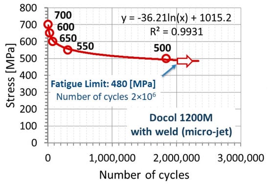 Generally, the fatigue tests confirmed that the joints are of high quality. The Wöhler curve has been established as a key characteristic for determining the quality of the weld examined. The fatigue strength was obtained at a satisfactory level of 480 MPa (Figure 10). Therefore, this kind of data can be used by a lot of engineer and research groups for designing and modeling. It is worth noting that data in the form collected are presented purely indicating an insufficient number of results for designing the high-strength steel behavior. Non-destructive and destructive tests confirmed that the correct joint was obtained from Docol 1200 M steel thanks to the use of micro-jet cooling in MAG welding.