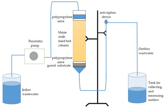 The continuous flow adsorption laboratory pilot experiment developed for synthetic solution evaluation was performed in a glass column (Ø = 4.5 cm and H = 50 cm). For this purpose, the previously presented column was packed with a known quantity of material (100 g of activated maize stalk after swelling in water) and hence a biomaterial bed (Hb) of 40 cm was achieved. In order to keep Hb, a polypropylene sieve was installed at the top of the column. Moreover, 4 cm of substrate gravel was introduced inside the bottom of the column. Thus, during the experiment, inflow solution was pumped through the column in downflow mode by a peristaltic pump with a constant volumetric flow Q = 0.6 mL/min, for 11 days, through the biomaterial bed (Figure 1). Our pilot installation was composed of a peristaltic flow controller, a glass column with Vt = 800 cm3, Vw = 640 cm3, and a tank for collecting and measuring outflow.