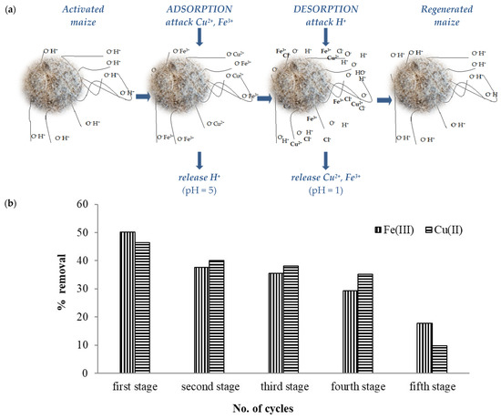 At present, the reutilization of vegetable materials in the adsorption process represents a significant benefit not only from an economic point of view but also for environmental protection [17,38,39]. Taking into consideration these aspects, the following experiment was performed to evaluate the reutilization of maize stalk. After the first utilization of the maize stalk mass, a desorption stage was conducted. The desorption process was applied after each adsorption stage. The adsorption/desorption mechanism of Cu(II) and Fe(III) on shredded maize stalk (1 mm) for the new reutilization stage is presented in Figure 3a.