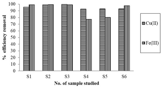 High concentrations of available metals obtained by applying the leachate test may exert a negative effect on the environment over time, and thus, in this study, the issue of unconventional technology and additionally of specific recovery to increase the economic efficiency of metal production was analyzed. To achieve this goal, depolluted samples were obtained using a batch laboratory procedure applying the methodology described in Section 2.6. Initially, for S1, the maximum adsorption capacity of 7.66 mg/g was obtained for Fe(III) and 1.98 mg/g for Cu(II). The experimental results for S2 revealed maximum capacities of the maize stalk as follows: 1.98 mg/g Fe(III) and 5.96 mg/g Cu(II) removed. For S3, the adsorption capacity determined for Fe(III) was 23.2 mg/g, and for Cu(II), it was 6.35 mg/g. Maize stalk mass removed from S4 was 15.6 mg/g Fe(III) and 2.78 mg/g Cu(II). In addition, efficient removal in the biomaterial mass was demonstrated for S5 (52.4 mg/g Fe(III) and 8.10 mg/g Cu(II)) as well as for S6 (37.3 mg/g Fe(III) and 4.22 mg/g Cu(II)), respectively. Moreover, efficient removal during the batch adsorption experiment is demonstrated in Figure 4. From another point of view, the percentages removed in the maize stalk mass were very high, ranging between 92.6% and 99.1% for Cu(II) and 77.3% and 99.3% for Fe(III), which suggests the quantitative retention of cationic species in all samples evaluated.