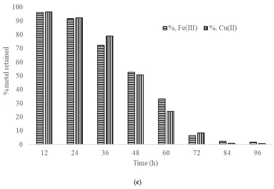 Moreover, the rapid adsorption of metals was observed when monitoring in continuous flow mode for 60 h (Figure 5c). Throughout the experiment, maize stalk demonstrated the capacity to remove up to 24.2% Cu(II) and 33.3% Fe(III) from inflow polluted mine water with 2.625 mg/L Cu(II) and 4.070 mg/L Fe(III) concentrations.