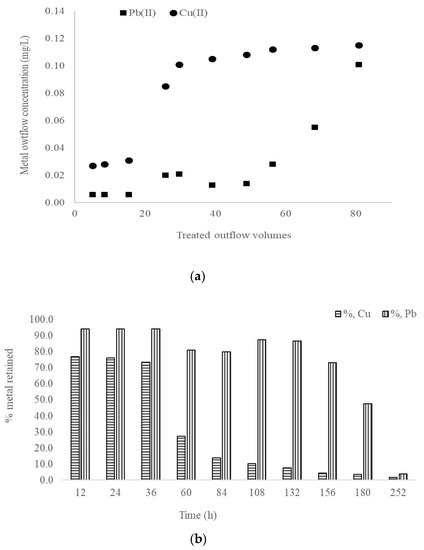 Another important finding is that, if we refer to the total volumes of water treated, taking into account the porosity fraction of the biomaterial bed [42], up to 68 volumes of water with 0.105 mg/L Pb(II) content may be treated and up to 15 volumes of inflow water with 0.117 mg/L Cu(II), showing the increased efficiency of the pilot experiment (Figure 6b).
