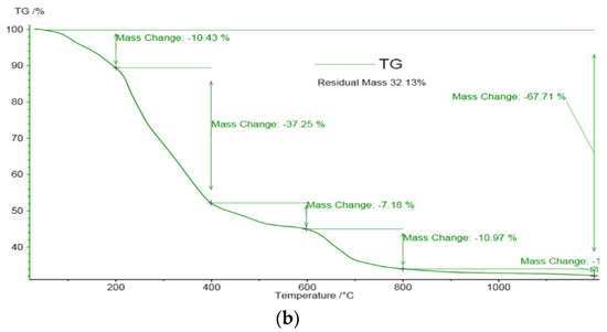 The adsorption of Cu(II) and Fe(III) ions in maize stalk after mine water treatment and from leachate tailing solutions was evaluated by thermal analysis. The thermal decomposition (TG) behavior of activated maize stalk was assessed in previous research [18]. Using TG, a variation in weight loss depending on the temperature range was observed. In the first pyrolysis stage, TG curves showed up to 5.29% and 10.5% weight loss in the 30–200 °C temperature range (Figure 8a,b) from the solid phases studied, which is associated with water molecules being retained by metal ions trough ionic bonds. In the next stage, significant weight loss in the 200–400 °C temperature range may be attributed firstly to hemicellulose and secondly to cellulose pyrolysis. The lower weight mass loss of 32.3% for maize stalk loaded with tailing solution suggests the occurrence of metal ion retention in the biomaterial mass, which influenced the stabilization of the hemicellulose/cellulose structure.