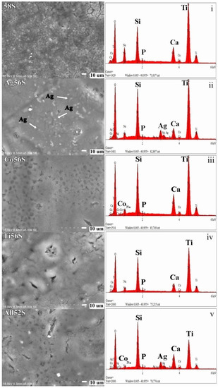 SEM micrographs (5000×) and EDX spectra of different bioactive glass coatings: i. 58S, II. Ag56S, iii. Co5S, iv. Ti56S and v. All52S. The arrows indicate the “Ag” particles.