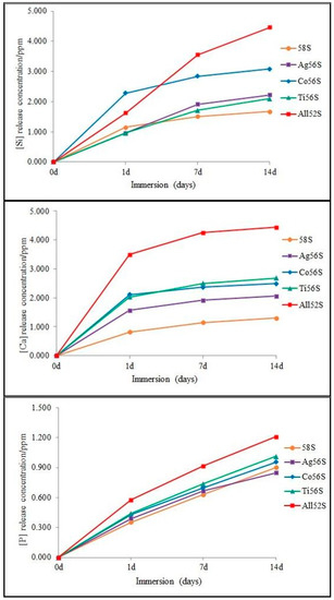 The release of Si, Ca and P ions from the coatings are shown in Figure 2. All coatings displayed different increasing rates of Si, Ca and P ion release. The degradation of porous bioactive glass coatings, except P released from the Ag56S coating, was faster than that of the 58S bioactive glass coating at 14 d of immersion in Tris–HCl solution. The highest release rate of Si, Ca and P ions was observed for the All52S bioactive glass coating at 14 d.