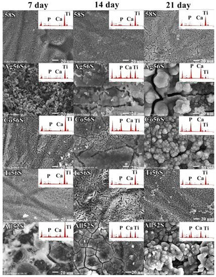 The surface topography of all the bioactive glass coatings is shown in Figure 1. A uniform deposition of bioactive glass particles on the 58S bioactive glass coating was found. For doped porous bioactive glass coatings, a smooth surface morphology with a porous structure could be observed. Some micro cracks were observed for the porous bioactive glass coatings. As shown by the EDX spectra (Figure 1), the chemical composition for each bioactive glass coating was comprised of Si, Ca, P, Ag, Co and Ti, respectively.