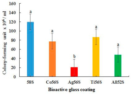 Antibacterial activity against Porphyromonas gingivalis for the bioactive glass coatings. Different letters mean the groups are significantly different (p < 0.05).