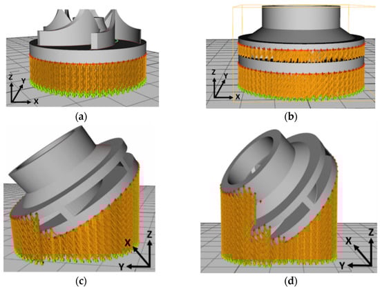 Building direction and support structure for the open and closed impeller models: (a) open impeller—built at orientation of Z axis (building direction); (b) closed impeller—built at orientation of Z axis (building direction); (c) closed impeller—built in orientation B + 32° (angled 32°); (d) closed impeller—built at orientation B + 45° (angled 45°).