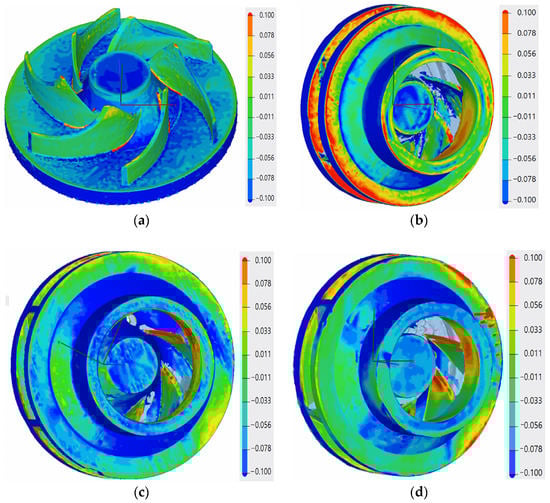 Exterior geometrical evaluation of the AM impellers: (a) evaluation of the open impeller for 0°; (b) evaluation of the closed impeller for 0°; (c) evaluation of the closed impeller for 32°; (d) evaluation of the closed impeller for 45°.