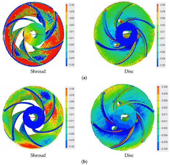 Prior to the geometrical evaluation of the as-printed parts, the support material was removed using classical machining (turning). The dimensional accuracy for the open impeller showed that the printing process follows the geometrical constraints of ± 0.1 mm on the blade positioning and tolerances, as presented in Figure 6a, with respect to the CAD model. For the three closed impellers, the variations of the component on the building platform at 0°, B + 32° and B + 45° showed an improvement in dimensional accuracy, as the average values are more consistent and closer to the imposed requirements. The blue shades on the back of the impellers were not considered deviations from the geometrical constraints as the turning process removed 0.1–0.2 mm of material during support structure removal. However, a profile deviation was observed on the exterior of the shroud top (maximum −0.235 mm) due to the printing angle, but as the offset for the SLM process was considered 1 mm, the resulting profile deviations from the printing process were considered acceptable.