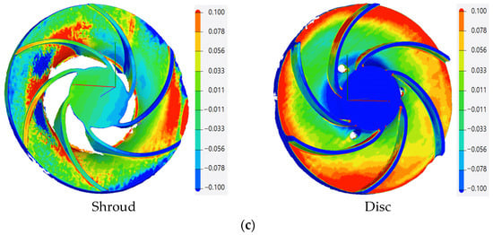 Geometrical evaluation of the AM closed impellers: (a) evaluation of the closed impeller for 0°; (b) evaluation of the closed impeller for 32°; (c) evaluation of the closed impeller for 45°.
