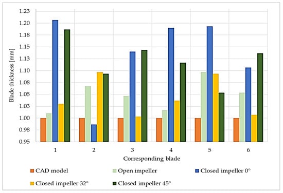 Although no blade profile deviations were observed for the open and closed impellers printed at the orientation of the Z axis (building direction), their blade thicknesses were affected, as can be seen from Figure 9. Although the open impeller presents acceptable thickness variations for all six blades (maximum ±0.1 mm), the closed impeller thickness variations are higher and are not compliant with the requirements. For the closed impeller printed at 32°, a more accurate and uniform thickness distribution was recorded, however, its blades’ profile deviations were higher than the imposed tolerances (Figure 8). For the third closed impeller, a more stable relationship was found between the tilting angle, profile deviation and blade thickness as compared with the two closed impellers printed at 0° and 32°. By varying the finishing process parameters, a more constant blade thickness can be obtained, but in the present case study, the main objective was to identify the most suitable printing angle in terms of geometrical evaluation.