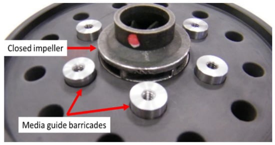 After a visual inspection, the AFM finishing process showed good results in terms of surface roughness improvement. However, small areas at the suction side of each blade tail remained unfinished. This was a result of the impeller blades’ geometry which does not guide the media along the full extent of the blade. A method to overcome this problem is to use different medium guide barricades and a different process parameter and will be investigated in a future research. The finished closed impeller is presented in Figure 11.