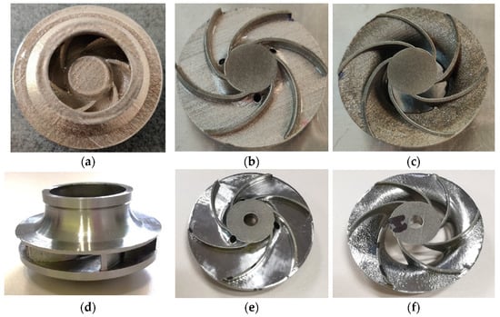 Post-processed (turned) closed impeller: (a) as-printed closed impeller; (b) as-printed disc half; (c) As-printed shroud half; (d) finished closed impeller; (e) finished disc half; (f) finished shroud half.