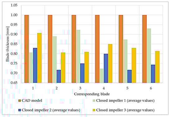 The red area on the shroud of the closed impeller printed at the orientation of the Z axis (building direction) shows the higher roughness of the part, as it is an overhanging area. The pressure side of the blades on the shroud part indicates a few profile deviations varying from −0.077 mm to +0.024 mm. However, these values are within the imposed tolerance of ±0.08 mm. For the closed impeller printed at a 32° orientation, the pressure side of the shroud blades presented a more stable geometrical accuracy compared to the suction side, but at the same time, the disc blades show an increase profile deviation for both the pressure and suction side (from −0.209 to +0.153 mm), higher than the imposed values. Further increasing the printing angle (45°) reduced the blades’ profile deviations from the imposed tolerance of ±0.08 mm. Nevertheless, due to the high tilting angle, the upper part of the impeller, namely, the foremost upper blade, presents a higher roughness due to its overhanging nature. Thus, a more intense red area appears on the suction side of the disc blade in Figure 8. Another analysis was made based on the blades’ thicknesses in order to verify if the printing angles also affect their dimensions, as this also represents an aspect that may influence the pump performance. Each blade was measured on both the shroud and the disc and a mean value is presented in Figure 9, as compared to the CAD model.