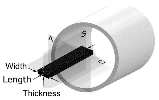 The MRI coordinate system consisting of Axial (A), Coronal (C) and Sagittal (S) view planes, as related to the test coupon dimensions, is depicted in Figure 2.