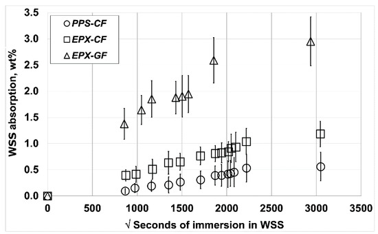 From the data, it can be concluded that a Fickian diffusion linear behaviour with respect to the square-root-of-time is approached at low WSS absorption levels. However, at higher concentrations, a two-stage absorption transient occurs for the thermosetting matrix laminates. This behaviour, which is typical of glassy polymers like epoxy resins, is because diffusion begins to become faster than the polymer chains relaxation [58,59]. While the transition for the EPX-CF laminate occurs after 46 days (2000 squared seconds) of immersion, the EPX-GF exhibits it much earlier, 33 days (1750 squared seconds), which is compatible with the much higher void content presented by the GFRP, as discussed ahead in the text. On the other hand, WSS absorption data for PPS-CF indicate only minor signs of the above cited transition, which is consistent with its partially crystalline structure.