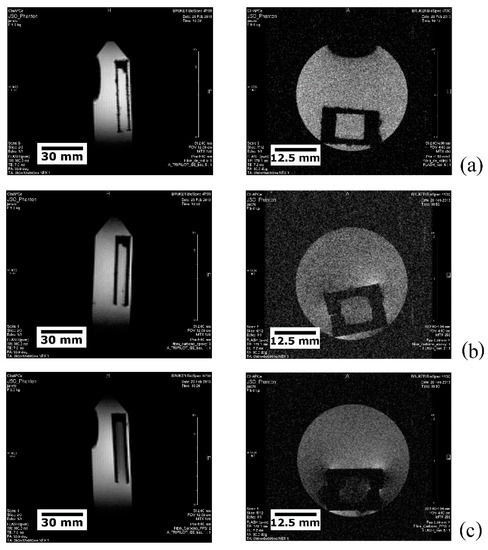 As seen in Figure 5a, the GFRP vessel presents the lowest EMI shielding (typically not higher than 1 dB in the GHz frequency level) [60], which is supported by the high contrast between the solid (dark) and the liquid (bright, i.e., background signal) phases, as well as by the identical aspect exhibited by the inner and outer fluids. Figure 5b refers to the EPX-CF vial, where moderate EMI noise (typically 40 to 140 dB with a frequency range of 10 Hz to 1.5 GHz) [61,62], causes a somewhat blurred and dull image; besides, image distortion in one of the vessel corners is noticed due to the electromagnetic interference. The PPS-CF container produces the highest EMI signal (Figure 5c) amongst the studied composite laminates, as revealed not only by the low contrast between the inner water and the composite walls, but also from the deviation from the rectilinear projection of the vessel corners.