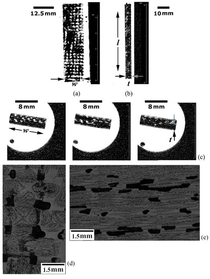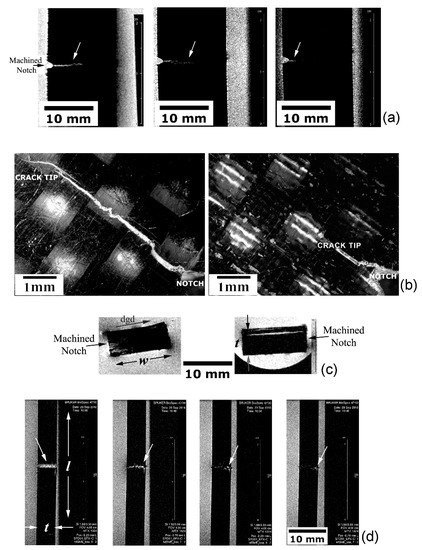 Several full-thickness (t) test coupons in the form of 12.5 mm-width (w) × 50 mm-length (l) tablets were extracted via water-cooled circular diamond saw from the practically void-free (i.e., free from typical manufacturing defects) high-quality EPX-CF and PPS-CF laminates. For both laminates, two test pieces for each fracture mode, namely, translaminar and delamination, were then tested in flexure until their maximum load-carrying capacity, so that the corresponding average fracture strength could be determined. These specimens are shown in Figure 1a,c (translaminar fracture mode) and Figure 1b,d (delamination mode).