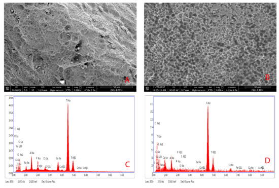 Scanning electron microscopy images of a failing dental implant: (A) Group I implant surface at ×2000 magnification; (B) Group II implant surface at ×2000 magnification; (C) EDX analysis diagram of Group I; (D) EDX analysis diagram of Group II.