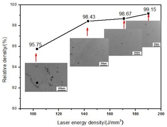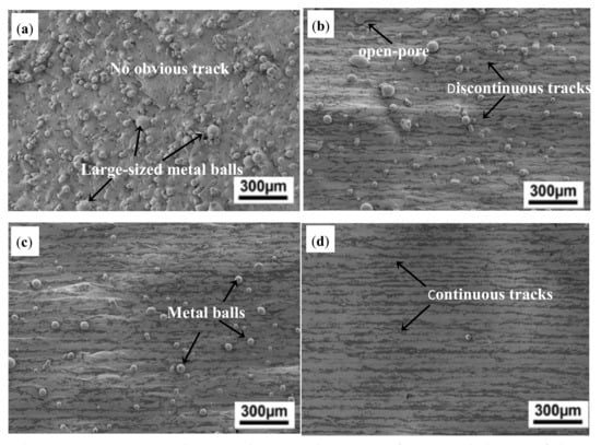 where was the surface tension in the pool liquid, m was the atomic mass, kB was the Boltzmann constant, and T was the molten pool temperature. According to the formula, the lower the molten pool temperature T, the higher the dynamic viscosity μ was. Under relatively high scanning speed, the smooth outward diffusion of the liquid phase was hindered due to the high viscosity of the molten pool liquid phase, leading to the discontinuity of the scanning trajectory and the formation of surface open holes in the present layer. In addition, this also caused a bumpy surface, impeding the swiping of the next layer of powder, which may lead to the bridging of powder particles. Such pores sometimes extended to several layers, reducing the density of the SLM-formed samples. At the same time, the balling effect also promoted the reduction of surface integrity and density level. As the previous literature [,,], the pre-spread metal powder will be completely melted in the present laser parameters, the scanning track can be regarded as a liquid phase cylinder. When satisfying the condition of (where λ the laser wavelength and D the original diameter of the undisturbed liquid cylinder), the stability of the liquid cylinder can be maintained. At a constant λ, the combined effect of higher scanning speed and lower laser power input will rapidly reduce the diameter D of the liquid phase cylinder, making it impossible to meet the above premise. At this time, the liquid cylinder became more unstable, and the surface energy was reduced by changing the shape into an equilibrium spherical state, resulting in the discontinuity of the scanning tracks on the upper surface of the formed sample. With the increment of the input E, the weakening of the liquid viscosity and the balling effect promoted the densification level to be significantly improved. Therefore, when E was set properly, samples with good surface integrity and near-full density can be obtained.
