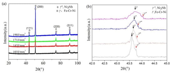 Figure 5a is the general exhibition of XRD diffraction peaks for the SLM-Inconel 718 samples under different E. It can be found that the strong diffraction peaks corresponding to matrix phase -Cr-Fe-Ni and precipitating phase ″-Ni3Nb were clearly detected. However, the peak positions of the two phases are overlapping to a large extent. In order to distinguish the phases composition more accurately, further XRD slow-scanning over a narrower range of 2θ = 42°–45° (Figure 5b) was performed. As the input E increased, the location of the diffraction peaks shifted significantly to larger 2θ, and the diffraction peaks of and ″ were obviously broadened and the peak intensity decreased apparently, indicating the smaller lattice parameters of -Cr-Fe-Ni with increasing E. The specific value of 2θ location and the peak intensity of and ″ phases are listed in Table 3.