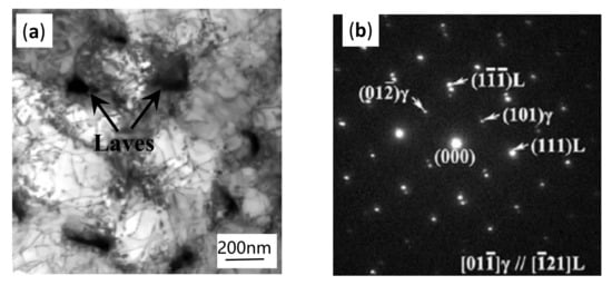 (a) TEM image displaying the irregular precipitates in the X-Y plane and (b) SAED patterns of Laves and