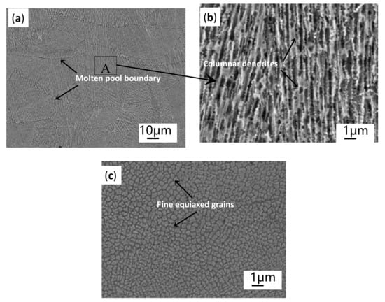 Typical SEM micrographs of as-built sample:(a) dendrites growing through multilayers on cross-section (X–Z plane); (b) clear columnar dendrites on the vertical section in the melt pool’s central fusion zone, which is the high-magnified micrograph of the area A in Figure 6a; (c) the fine equiaxed grains on the X-Y plane in the melt pool’s central fusion zone.