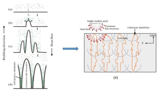 Zhang et al. [] conducted a numerical simulation of the heat flux field of laser micro-molten pool and explored the influence of heat flow field on SLM technology. The results show that the surface tension caused by the temperature gradient on the surface of the molten pool drives the Marangoni convection, making the flow state of the SLM-process fluid mainly outward convection. Although the heat flow of a single molten pool varies from the edge to the center, in general, the main direction of the temperature gradient is almost consistent with the Z-axis, so columnar dendrites can grow through multi-layer structures in the Y-Z plane.