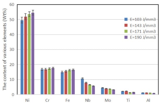 Figure 11 shows EDS analysis results for the contents of various elements in the center of the columnar dendrite microstructure under different E. It is found that the content of Ni element in the center of the columnar crystal rapidly increased from 49.56% to 54.52% as E increasing from 103 J/mm3 to 190 J/mm3. According to the solid solution theory [], other refractory alloy elements of the matrix were replaced by a large number of Ni elements. It is known from XRD analysis that the constituent elements of the solidified matrix phase are Cr, Fe, Ni. Among them, the atomic radius of Ni element is the smallest, and the solid solution of Ni atom into the matrix phase causes negative lattice distortion, which reduces interplanar spacing of the matrix phase, further confirming the theoretical inference in Section 3.2.