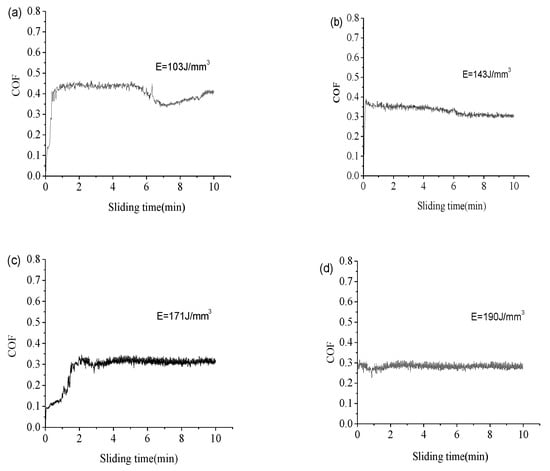 COF of the SLM as-built parts under different E over the sliding time. (a) COF of the SLM as-built parts under E = 103 J/mm3 over the sliding time; (b) COF of the SLM as-built parts under E = 143 J/mm3 over the sliding time; (c) COF of the SLM as-built parts under E = 171 J/mm3 over the sliding time; (d) COF of the SLM as-built parts under E = 190 J/mm3 over the sliding time.